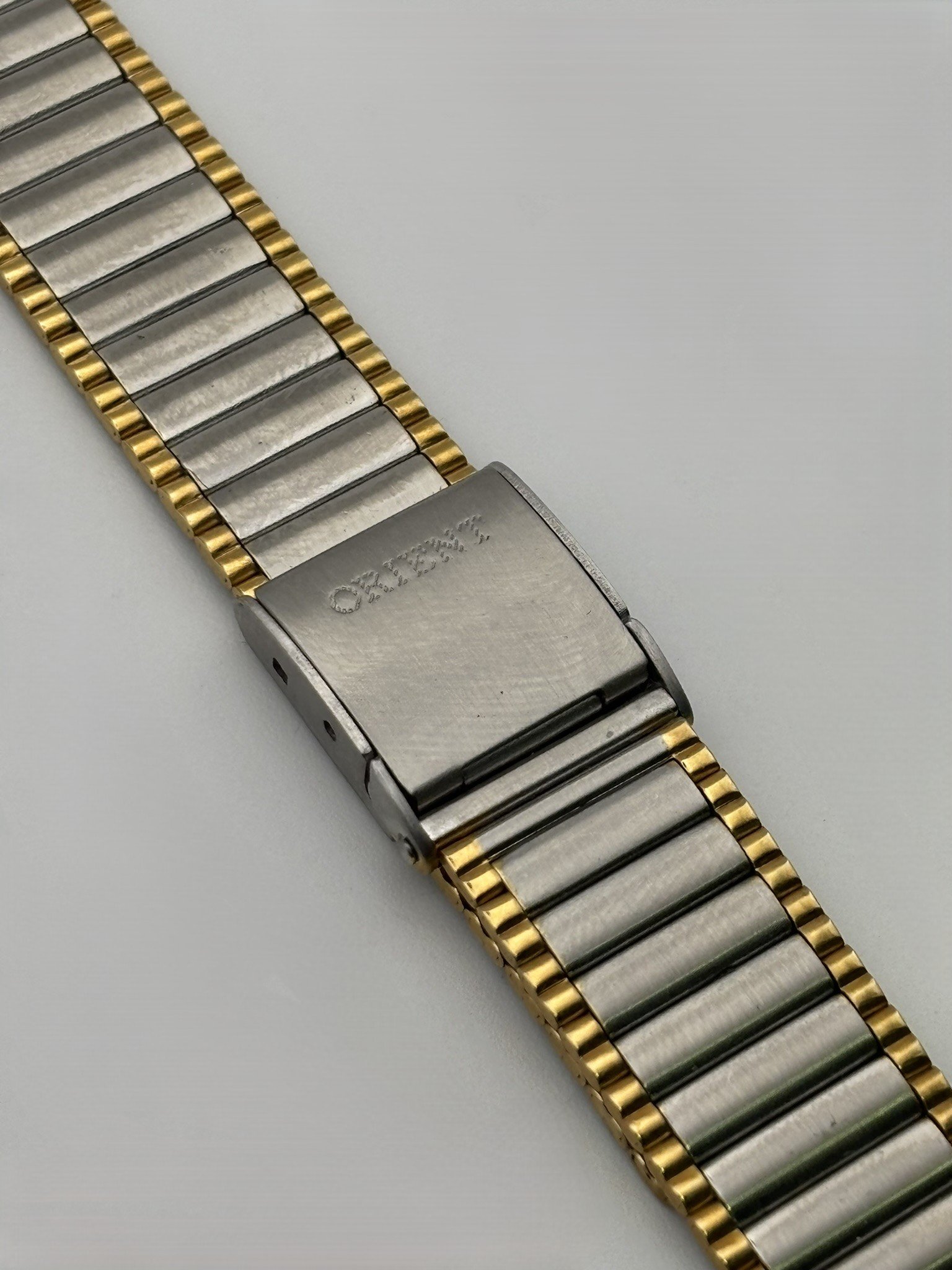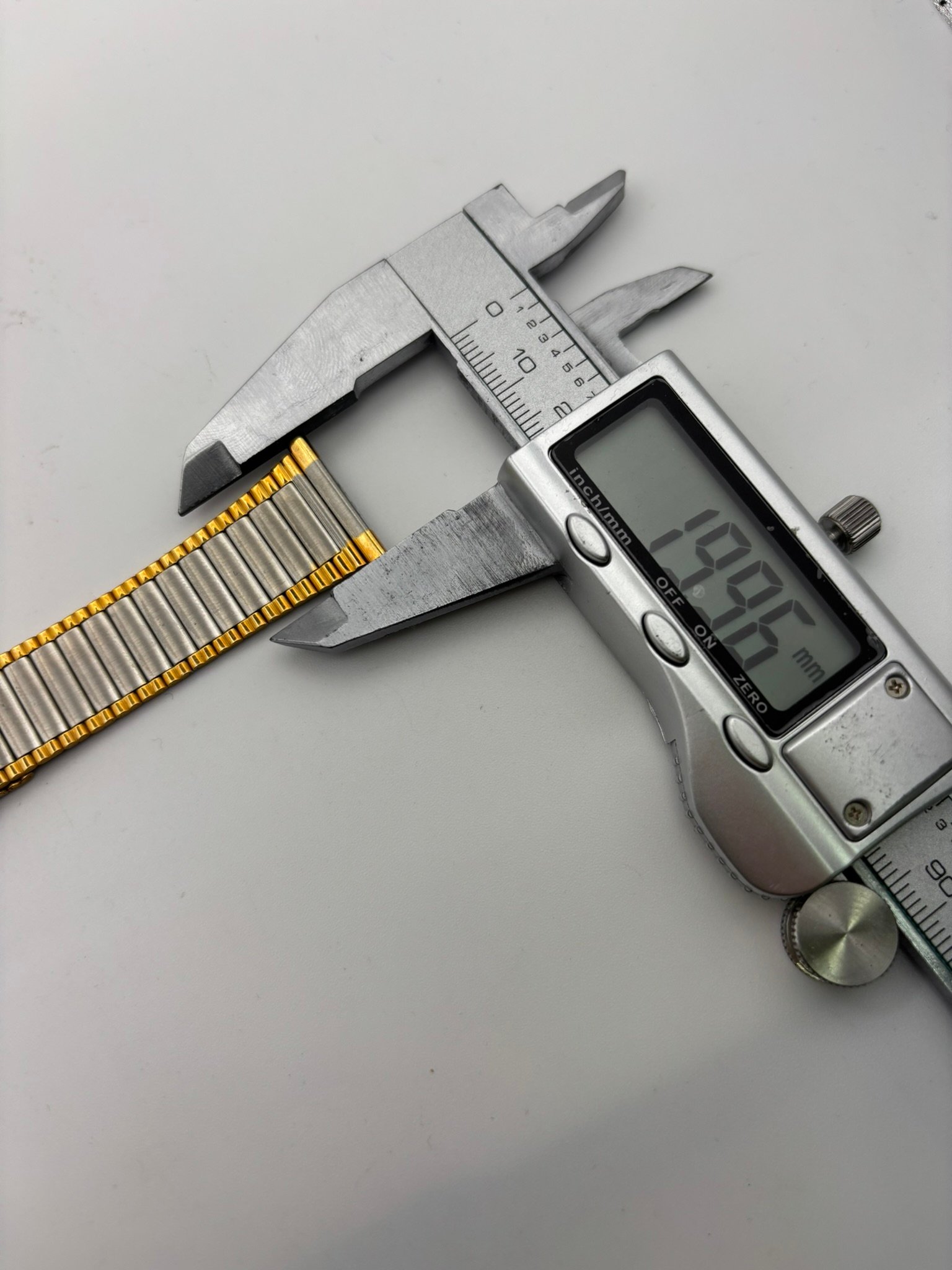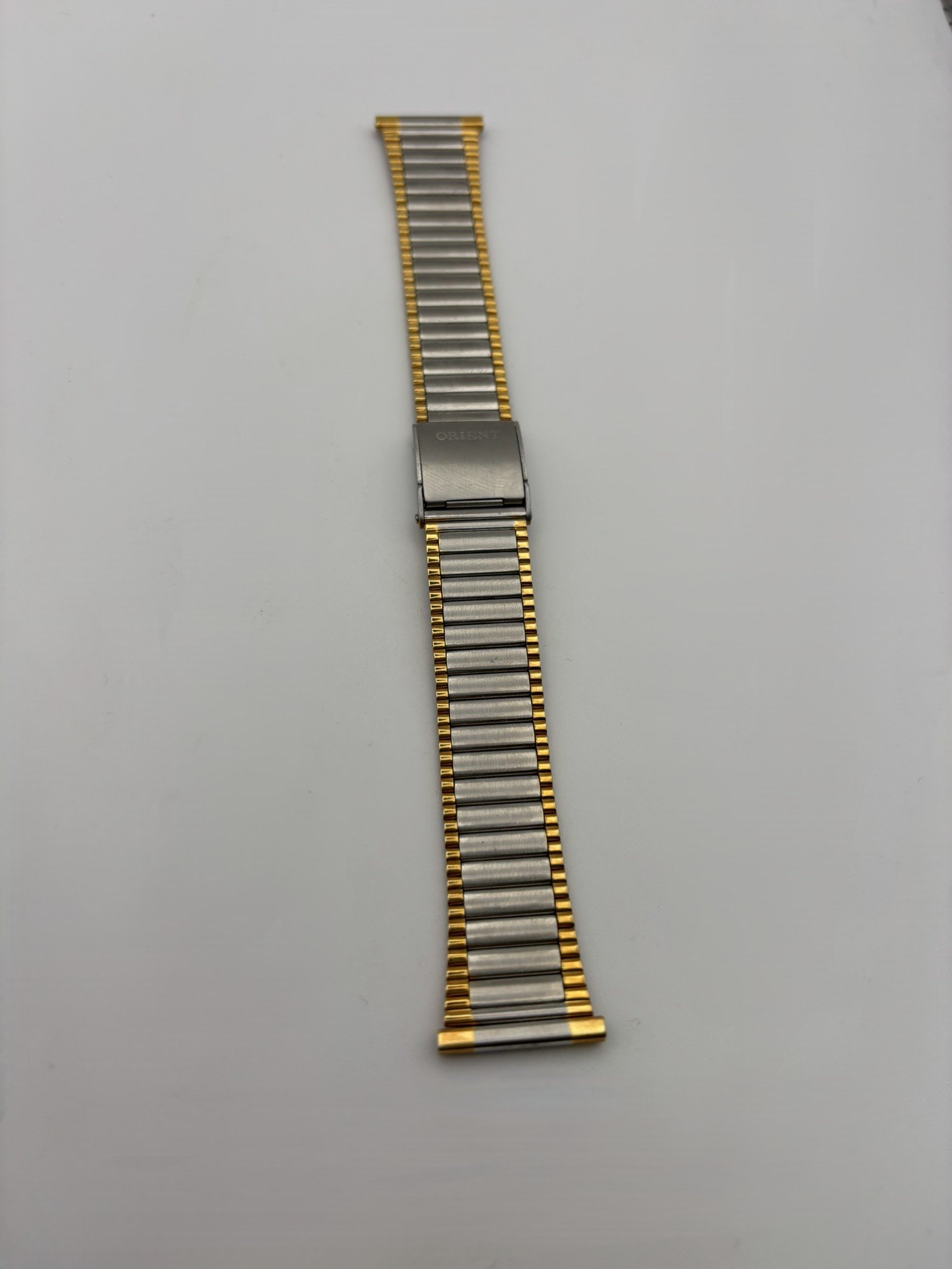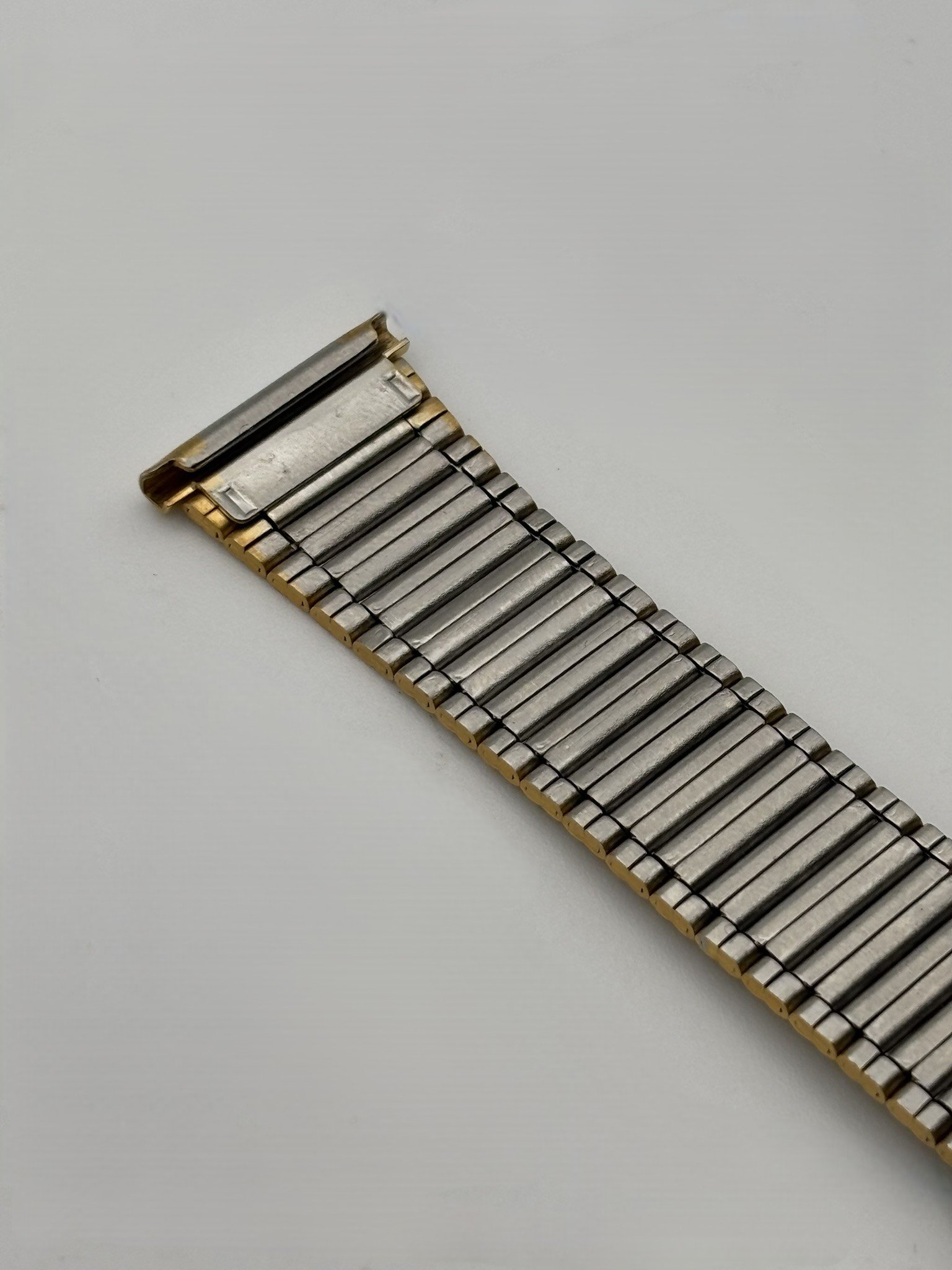 Vintage επεκτεινόμενο μπρασελέ ρολογιού σε κομψό δίχρωμο χρυσό και ασημί φινίρισμα. Διαθέτει ελαστικό μηχανισμό (stretch) για άνετη εφαρμογή και εύκολη τοποθέτηση στον καρπό. Κλασικός σχεδιασμός με χρυσούς εξωτερικούς κρίκους και ασημί κεντρικούς.