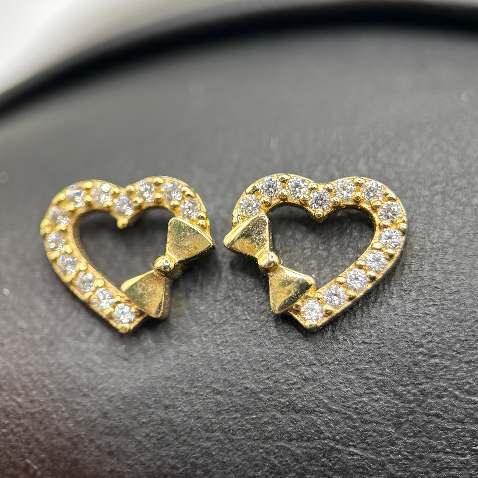 Ρομαντικά σκουλαρίκια Κ9 σε σχήμα καρδιάς, διακοσμημένα με λαμπερά ζιργκόν και λεπτομέρεια φιόγκου.
