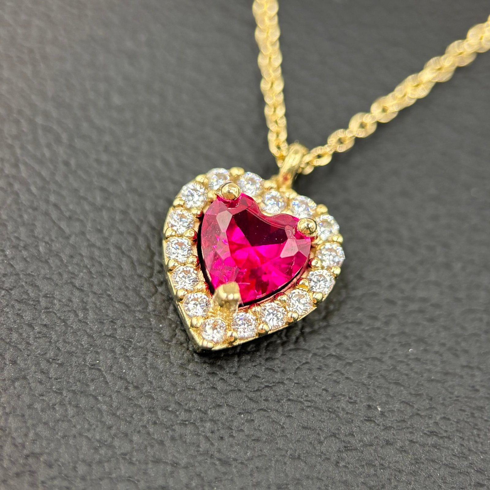 Ρομαντικό κολιέ από κίτρινο χρυσό Κ14, με καρδιά από ροδολίτη που περιβάλλεται από λαμπερά ζιργκόν.