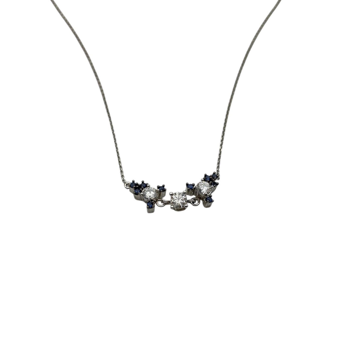 Ένα ρομαντικό κολιέ με τριπλό λουλουδάτο σχέδιο, στολισμένο με λαμπερά λευκά και βαθιά μπλε ζιργκόν που δημιουργούν κομψή αντίθεση.