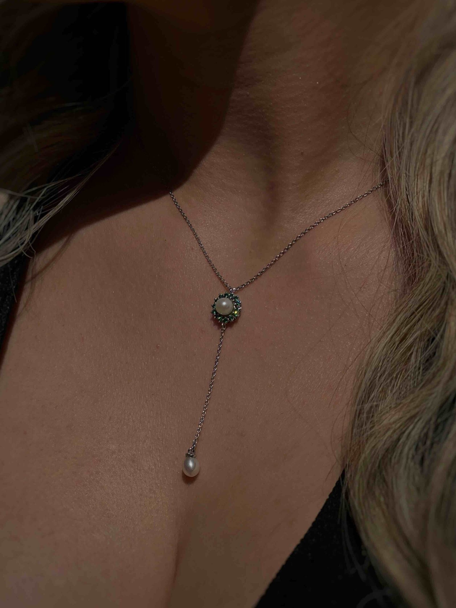 Το κεντρικό μαργαριτάρι πλαισιώνεται από πράσινα ζιργκόν, δημιουργώντας μια εκλεπτυσμένη χρωματική αντίθεση που φωτίζει τον λαιμό.
