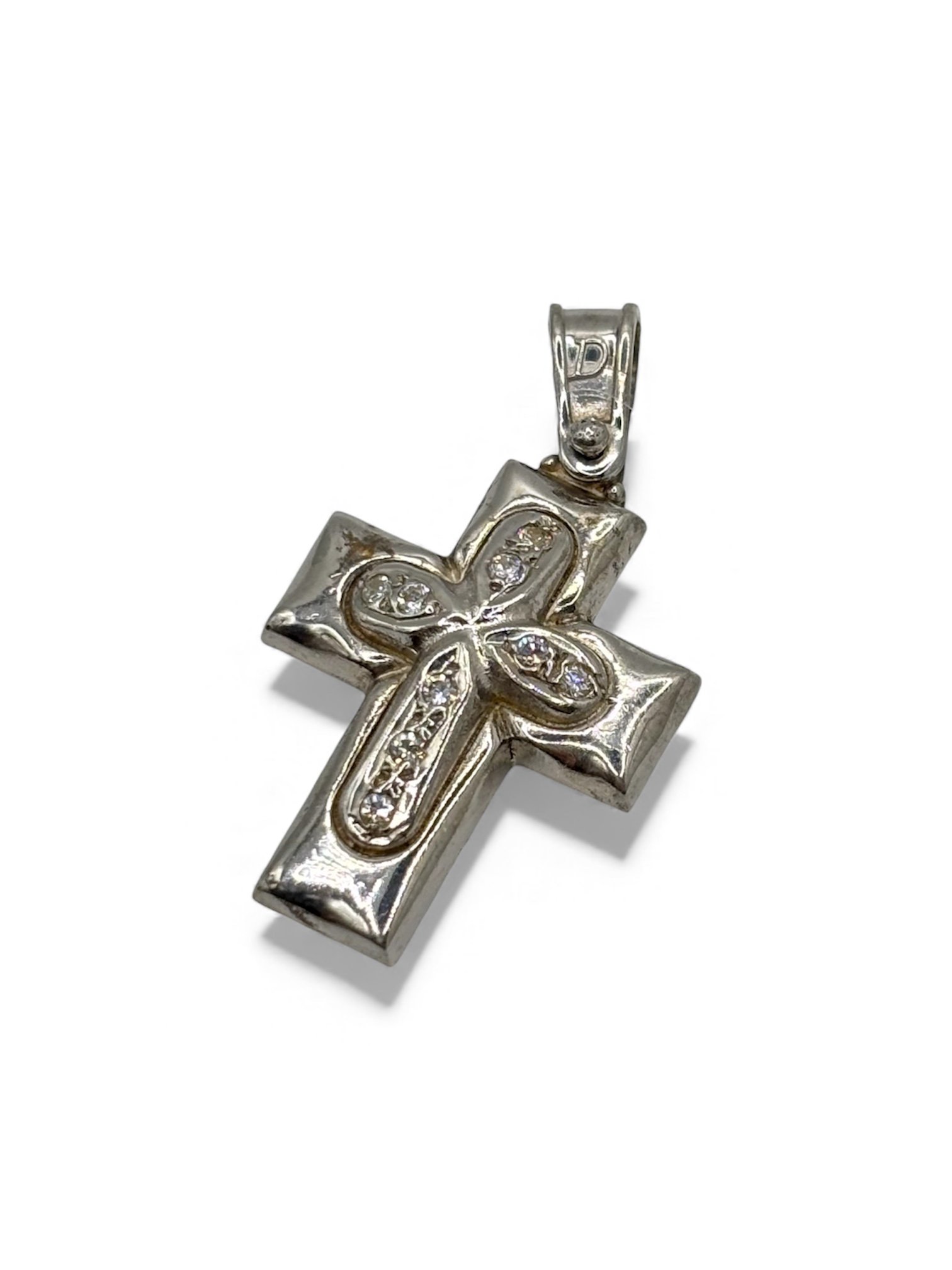 Τα διακριτικά ζιργκόν που κοσμούν το εσωτερικό του σταυρού προσθέτουν μια ήπια λάμψη, διατηρώντας την ισορροπία ανάμεσα στην κομψότητα και τον συμβολισμό.