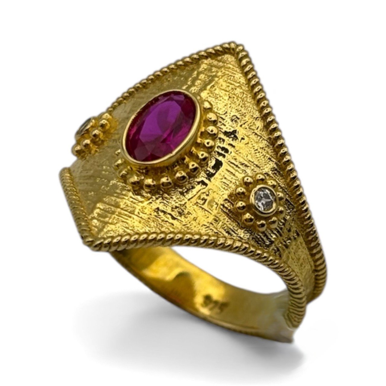 Το κεντρικό Ροζ οβάλ ζιργκόν φωτίζει άμεσα το κόσμημα, ενώ η περίτεχνη ανάγλυφη επιφάνεια σε σχήμα ρόμβου προσθέτει βάθος, χαρακτήρα και μια έντονη βυζαντινή αισθητική.