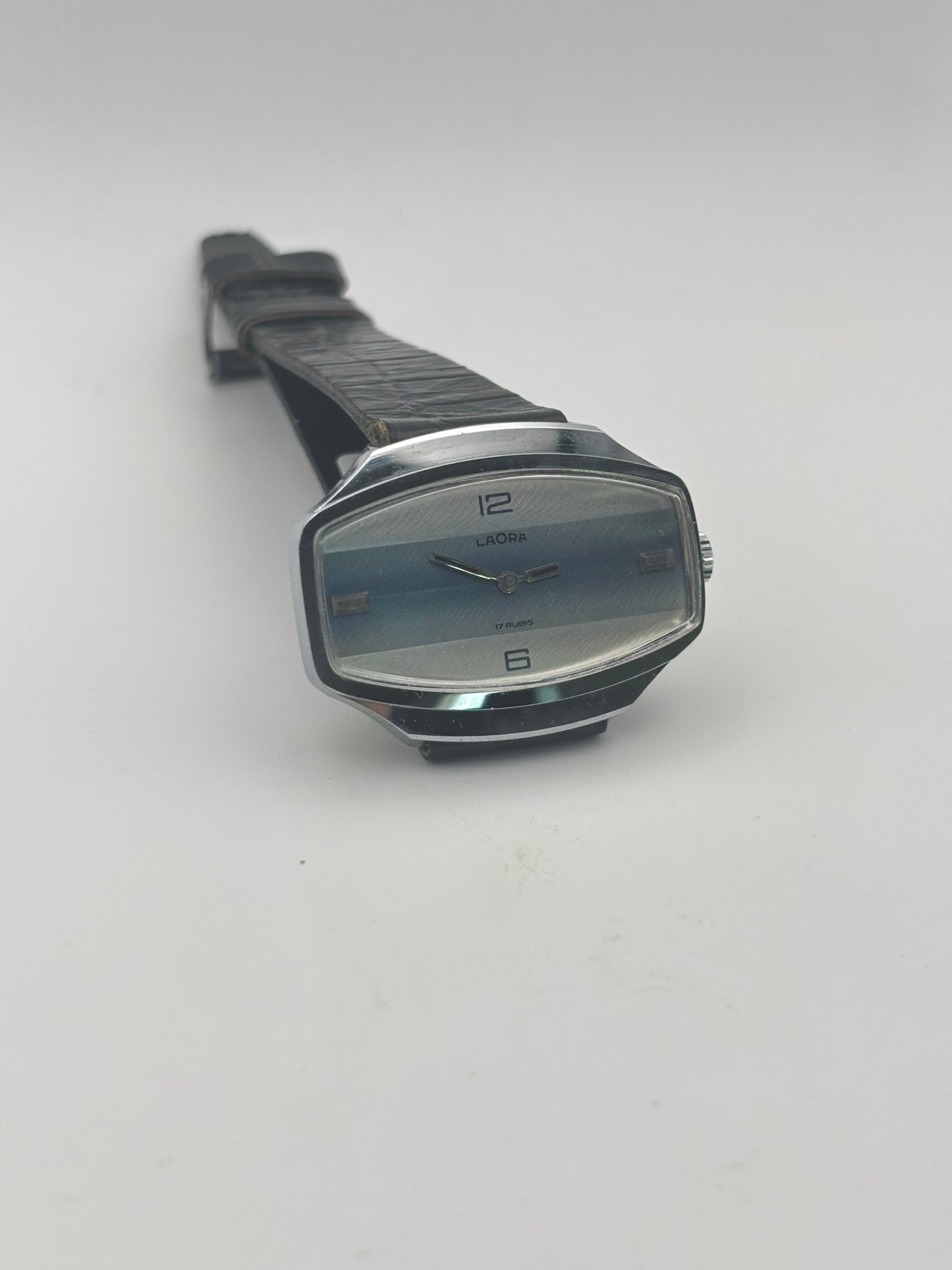Κομψό vintage μηχανικό ρολόι χειρός Laora, με ιδιαίτερο οβάλ/tonneau σχεδιασμό κάσας και διαχρονική αισθητική που παραπέμπει σε ευρωπαϊκή ωρολογοποιία προηγούμενων δεκαετιών. Το ρολόι διαθέτει μηχανικό μηχανισμό 17 Rubis, προσφέροντας αξιοπιστία και αυθεντική εμπειρία μηχανικού ρολογιού.
